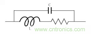 導(dǎo)線在圓導(dǎo)體柱上繞制而成,因此電感除了考慮本身的感性特征,還需要考慮導(dǎo)線的電阻以及相鄰線圈之間的分布電容。電感的等效電路模型如下圖所示,寄生旁路電容C和串聯(lián)電阻R分別由分布電容和電阻帶來的綜合效應(yīng)。
