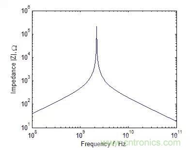 同樣可以得到一個(gè)典型的電容器的阻抗絕對(duì)值與頻率的關(guān)系。如下圖所示,由于存在介質(zhì)損耗和有限長的引線,電容顯示出與電阻同樣的諧振特性。