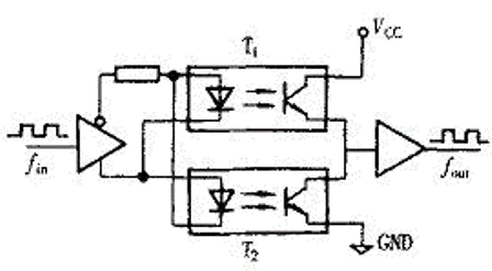 用2只光電耦合器T1,T2接成互補(bǔ)推挽式電路,可以提高光耦的開關(guān)速度,如圖5所示。當(dāng)脈沖上升為“1”電平時,T1截止,T2導(dǎo)通。相反,當(dāng)脈沖為“0”電平時,T1導(dǎo)通,T2截止。這種互補(bǔ)推挽式電路的頻率特性大大優(yōu)于單個光電耦合器的頻率特性。