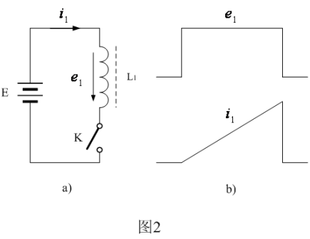 在圖1中,當(dāng)輸入電壓E加于開關(guān)電源變壓器初級線圈N1的兩端時(shí),由于變壓器次級線圈產(chǎn)生的電動(dòng)勢與流過二極管的電流方向正好相反,相當(dāng)于所有次級線圈均開路,此時(shí)開關(guān)變壓器相當(dāng)于一個(gè)電感L1。其等效電路如圖2-a) 所示,圖2-b) 是開關(guān)接通時(shí),電感兩端的電壓和流過電感L1的電流。