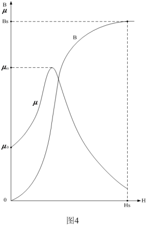由圖4中可以看出,導(dǎo)磁率最大的地方并不是磁感應(yīng)強(qiáng)度或磁場強(qiáng)度最小或最大的地方,而是位于磁感應(yīng)強(qiáng)度或磁場強(qiáng)度的某個(gè)中間值的地方。當(dāng)導(dǎo)磁率達(dá)到最大值之后,導(dǎo)磁率將隨著磁感應(yīng)強(qiáng)度或磁場強(qiáng)度增大,而迅速下降;當(dāng)導(dǎo)磁率下降到將要接近0的時(shí)候,我們就認(rèn)為變壓器鐵芯已經(jīng)開始飽和。如圖中Bs和Hs。