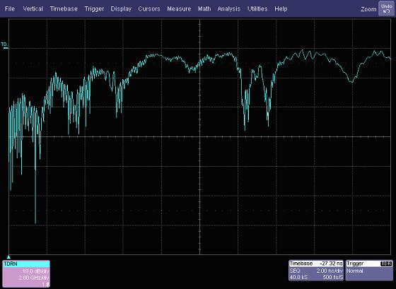 回波損耗或S11 是頻域的測量和反射系數(shù)有關(guān)。歸一化(通過反射平面校準 基線校正)反射系數(shù)的傅里葉變換給出了回波損耗是頻率的函數(shù)。圖2給出了USB 3.0線纜和連接器測量的結(jié)果。圖中的橫軸表示2GHz/div,范圍是0~20GHz,縱軸表示10dB/div。回波損耗在2GHz大約是15dB,但隨著頻率的增加開始變得越來越小。精細的空值間隔是由線纜末端的連接器引起的,較大的空值間隔是由于連接器內(nèi)部的阻抗結(jié)構(gòu)決定的。