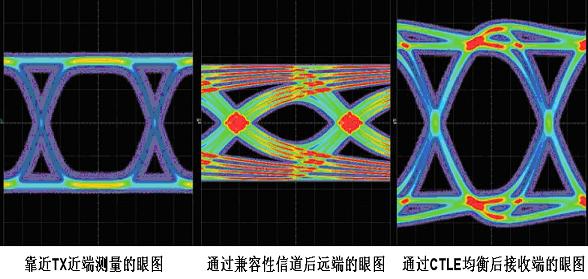 如下圖5所示,左邊的眼圖是靠近TX近端測量到的眼圖;中間的眼圖是通過兼容性信道(參考測試信道)后測量的眼圖,可見眼圖的張開程度較小,抖動較大;右邊的眼圖是仿真CTLE均衡后的眼圖,可見眼高和抖動都得到改善。