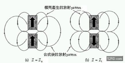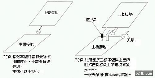 此處采取在連接移動通訊系統折疊機殼上增設阻抗(Impedance)Z,如此就能夠利用一種天線獲得多樣的放射pattern,這種設計最大優點是可以大幅縮小天線的設置場所與天線結構物的尺寸。