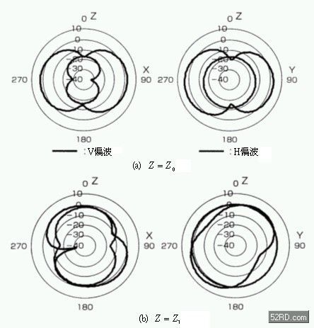 為了探討放射pattern的變化原理,因此對機殼施加電流藉此觀察電流分布特性,根據圖8的測試結果顯示,Z=Z0時上下機殼都有同相電流流動,而且與圖7的放射pattern一樣都是呈側向8字形,由于Z=Z0時為同相電流,因此電界是以側向加算;相對的Z=Z1則變成逆相電流,因此電界橫向相互抵銷,放射pattern整體呈蝶翼狀。由此可知只要改變抗Z就能夠控制機殼上的電流,并使電流產生的放射pattern發生變化。
