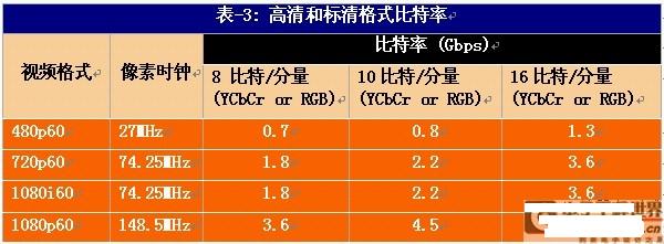 表-3列出了通過有線HDMI傳輸各種高清和標清視頻格式所需要的帶寬。
