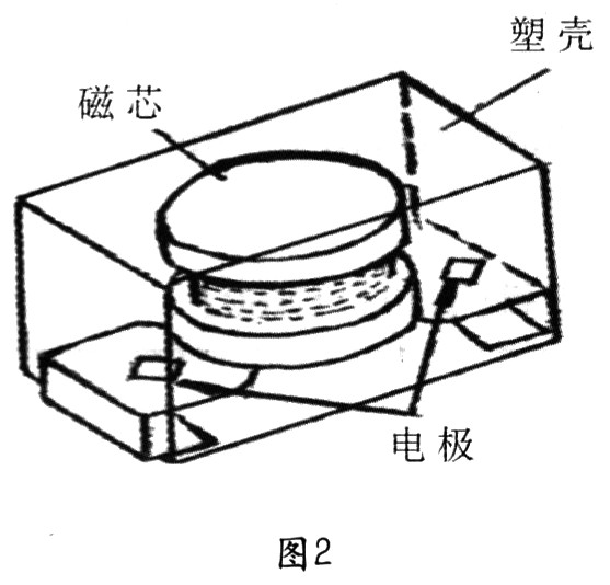 另一種形式的片式電感器是片式繞線電感器,這是對傳統繞線型電感器的一種改進,采用微小型工字型磁芯,經繞線、焊接、電極成型、塑封等工序制成,見圖2。這種類型的片式電感生產工藝簡單,電性能優良(電感量大,品質因素高),適合于大電流通過,可靠性好。但受磁芯尺寸和制造工藝限制,進一步微小型有困難。
