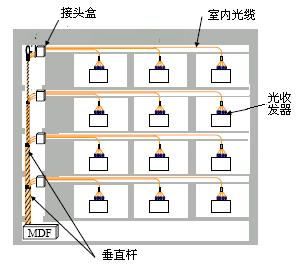總配線架(MDF)安裝在大樓內的公共地區,光纜通過垂直的桿狀物通向各樓層,再通過水平方向上的管道進入房間。