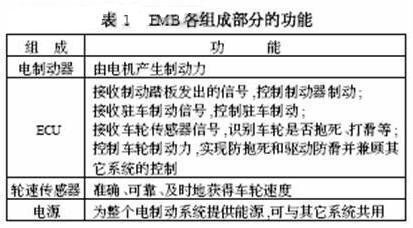 EMB主要用于小型車輛中,主要包含電制動器、ECU、輪速傳感器、動力電源等。它與EHB最大區別是制動力為電機提供的轉矩,而不是由柱塞泵產生的高壓油,且有獨立的電源來供電,其各部分的功能如表1。