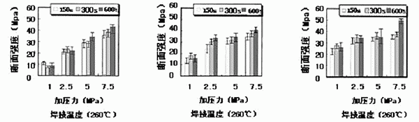 圖9顯示了焊接溫度、焊接時間、加壓等焊接參數對銀納米粒子銅觸點斷面強度的影響。從圖可得,焊接溫度和加壓是影響斷面強度的關鍵參數。在焊接溫度方面,強度隨著加壓增大而上升,但在焊接溫度高的情況下,加壓的影響會變小。另外就焊接溫度而言,加壓低的情況下,焊接溫度對強度影響大,而加壓增高時則焊接溫度的影響變小。所以,在260℃左右的溫度下加大壓力,而盡可能在低加壓場合提高連接溫度,這樣做才最有效。