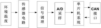 該溫度檢測節(jié)點由傳感器電路、信號調(diào)理電路、單片機應(yīng)用系統(tǒng)、CAN總線接口等構(gòu)成。電路基本工作原理是:傳感器電路將感應(yīng)到的溫度信號以電壓的形式輸出到信號調(diào)理電路,信號經(jīng)過調(diào)理后輸入到A/D采樣電路,由ADC將數(shù)字量值送給單片機系統(tǒng)。單片機系統(tǒng)將監(jiān)控實時溫度,當(dāng)溫度超過警戒值和危險值時,單片機將主動發(fā)送警告信息到上位機,提醒操作人員檢查。模塊邏輯結(jié)構(gòu)如圖1所示。