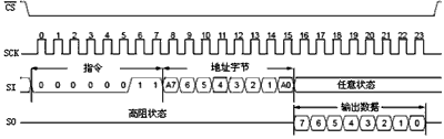 在讀操作開始時,CS引腳將被置為低電平。隨后讀指令和8位地址碼(A7~A0)將被依次送入MCP2510。在接收到讀指令和地址碼之后,MCP2510指定地址寄存器中的數(shù)據(jù)將被移出通過SO引腳進行發(fā)送。每一數(shù)據(jù)字節(jié)移出后,器件內(nèi)部的地址指針將自動加一以指向下一地址。因此可以對下一個連續(xù)地址寄存器進行讀操作。通過該方法可以順序讀取任意一個連續(xù)地址寄存器中的數(shù)據(jù)。通過拉高CS引腳電平可以結(jié)束讀操作,如圖6所示。
