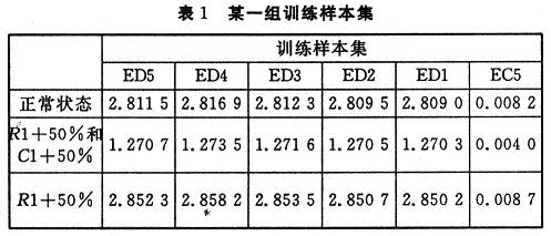 (1)構(gòu)造特征向量,提取能量特征信息:在pspice中對(duì)電路的每一種狀態(tài)進(jìn)行瞬時(shí)分析,取500個(gè)采樣點(diǎn),并對(duì)每一種故障模式進(jìn)行300次MonteCarlo分析,在Probe窗口中選擇菜單View\outputFile,或直接在Probe內(nèi)選擇菜單File\Export將波形采樣數(shù)據(jù)存盤,可得到out節(jié)點(diǎn)的具體信息,將數(shù)據(jù)轉(zhuǎn)化為MATLAB數(shù)據(jù)文件,然后進(jìn)行小波分析,在實(shí)驗(yàn)中,經(jīng)分析與比較,小波選擇db2小波,對(duì)每個(gè)故障信號(hào)進(jìn)行5尺度小波分解。得能量特征信息F=(ED5,ED4,…,ED1,EC5)。這里可利用MATLAB中的sumsqr函數(shù)。從而得到網(wǎng)絡(luò)的訓(xùn)練樣本集和測(cè)試樣本集。300次MonteCarlo分析,其中200次為訓(xùn)練樣本,100次為測(cè)試樣本。