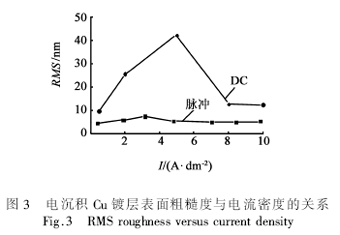 圖3為脈沖電鍍與直流電鍍電沉積Cu鍍層表面粗糙度RMS(rootmeansquare)與電流密度的關(guān)系。可見脈沖所得鍍層表面粗糙度僅為幾個納米,而直流所得鍍層表面粗糙度在10nm以上,最大時甚至達到了40nm,這樣大的粗糙度將為后續(xù)CMP工藝造成極大的困難。而平整的表面可以為CMP工藝提供一個易于進行處理的基底表面,采用脈沖電鍍Cu鍍層的表面粗糙度RMS比直流電鍍的低。