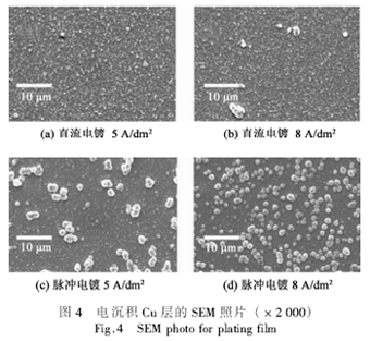 圖1是電沉積Cu層電阻率與電流密度之間的關(guān)系。可見,脈沖電鍍得到的Cu鍍層電阻率小于相同電流密度下的直流鍍層。在小電流密度時(<2A/dm2),直流鍍層和脈沖鍍層的電阻率都較大。