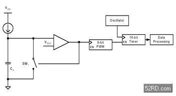 比較器的輸出用來作為脈沖寬度調(diào)變(PWM)的時脈,并進而成為使用高速內(nèi)部時脈計時器的極閘。當PWM產(chǎn)生插斷訊號時,計時器上的值就可以被讀取并且儲存該輸出值。