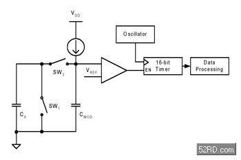 感測電容器CX與電流源都連接至一個類比多工匯流排上,其中電流源決定了感測電容器中充電的速率。而該電容器兩端電位差會隨著充電電荷累積到匯流排而產(chǎn)生線性增長,其關系式為q=CV。