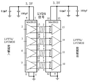 圖2是采用MAXIM公司的一片MAX9123驅動器和一片MAX9122接收器設計的一個4通道LVDS點對點連接的單工接口。該接口工作電源為+3.3V,驅動器輸入和接收器輸出數據為LVTTL/LVCMOS電平。