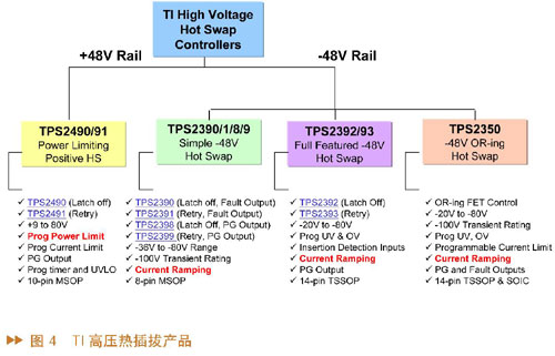 TI推出了很多熱插拔產(chǎn)品,并且多個(gè)產(chǎn)品中加入了特殊功能以提升熱插拔的工作功率,這能夠使熱插拔MOS管工作在安全區(qū),從而提高產(chǎn)品可靠度、降低成本。另外一個(gè)功能就是di/dt(電流上升的速率),這能夠減少噪音和對(duì)電路零件的沖擊。TI的熱插拔產(chǎn)品主要分為兩類:高壓熱插拔產(chǎn)品,針對(duì)48V、-48V或24V應(yīng)用;低壓熱插拔產(chǎn)品,針對(duì)3V到15V的應(yīng)用。