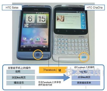 HTC發布了兩款適合使用SNS“Facebook”的智能手機。當利用攝像頭拍照等預測用戶想在Facebook上共享信息時,Facebook鍵會自動閃光。摁下該鍵就會進入上傳信息的畫面。