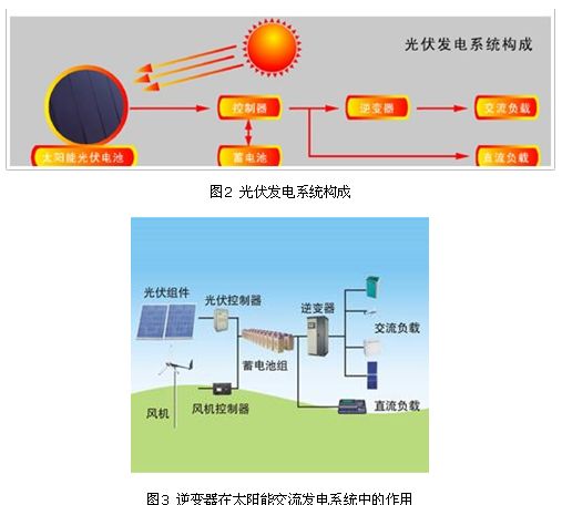 太陽(yáng)能交流發(fā)電系統(tǒng)是由光伏組件、光伏控制器、蓄電池組和逆變器共同組成(如圖1),,其中,逆變器是最重要的部分。逆變器是一種電源轉(zhuǎn)換裝置,其主要功能是將蓄電池的直流電逆變成交流電,圖2表示了逆變器在太陽(yáng)能交流發(fā)電系統(tǒng)中的作用。