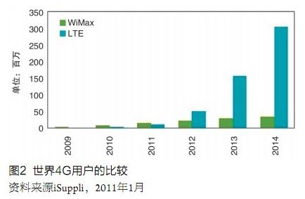 TD-LTE的主要競爭技術標準是WiMAX,它的應用早于前者。據iSuppli公司調查,2009年TD-LTE尚未投入應用,而WiMAX已擁有680萬用戶,預期近兩年內還將居于主導地位。不過,TD-LTE在世界頂級運營公司如美國的AT&T和Verizon、歐洲的Vodafone和TeliaSonera、日本的DoCoMo等的積極努力推動下將加速發展,今年用戶即可超70萬,明年用戶數將超越WiMAX,2014年可望突破3億大關,而屆時WiMAX僅能維持2003年3300萬左右的水平,兩者相差10倍(見圖2),由此可見TD-LTE的發展潛力。