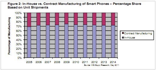 - 2014年合同制造商生產(chǎn)的手機(jī)份額將只有27.9%