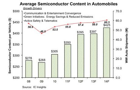據(jù)預(yù)計,汽車上裝備的半導(dǎo)體器件份額從2010年到2014年將以年均9%的速度增長,到2014年,平均每輛汽車上安裝的半導(dǎo)體設(shè)備的價值將提升到425美元左右。而驅(qū)動這種增長的則主要是通信應(yīng)用,娛樂類應(yīng)用,安全類應(yīng)用,遠程控制類應(yīng)用以及環(huán)保類應(yīng)用。