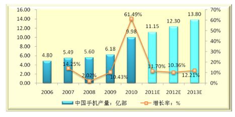 - 預計2010-2013年全球手機出貨量將保持7%以上的增速
