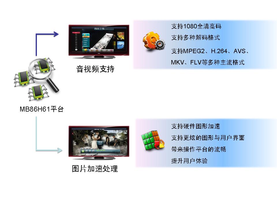 MB86H61系列芯片基于多核CPU架構,內部集成了富士通獨有專利技術的硬件視頻處理器視頻解碼單元解碼全高清/標清MPEG-2、H.264、VC-1、AVS、FLV、MKV等多種視頻格式,而音頻解碼單元則采用高性能的ARC725TM(594DMIPS)支持DD、DD+、AAC、DRA等多種先進音頻格式。因此,該芯片的ARM11內核主CPU將全部用于處理應用程序,其性能將有足夠的裕量,能充分保證系統(tǒng)運行的平穩(wěn)流暢。“獨立的硬件圖形加速功能還使其能更輕松地支持豐富的圖形用戶界面、高清圖片顯示,從而大大提升用戶體驗。”富士通半導體業(yè)務發(fā)展總監(jiān)黃自力表示,“該芯片對于全高清AVS視頻解碼的支持尤其值得一提,目前市場上大部分的高清芯片所能支持的AVS解碼還停留在標清階段。”