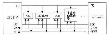 SPI(serial peripheral interface,串行外圍設(shè)備接口)總線技術(shù)是Motorola公司推出的一種同步串行接口。它用于CPU與各種外圍器件進(jìn)行全雙工、同步串行通訊。它只需四條線就可以完成MCU與各種外圍器件的通訊,這四條線是:串行時(shí)鐘線(CSK)、主機(jī)輸入/從機(jī)輸出數(shù)據(jù)線(MISO)、主機(jī)輸出/從機(jī)輸入數(shù)據(jù)線(MOSI)、低電平有效從機(jī)選擇線CS。當(dāng)SPI工作時(shí),在移位寄存器中的數(shù)據(jù)逐位從輸出引腳(MOSI)輸出(高位在前),同時(shí)從輸入引腳(MISO)接收的數(shù)據(jù)逐位移到移位寄存器(高位在前)。發(fā)送一個(gè)字節(jié)后,從另一個(gè)外圍器件接收的字節(jié)數(shù)據(jù)進(jìn)入移位寄存器中。即完成一個(gè)字節(jié)數(shù)據(jù)傳輸?shù)膶?shí)質(zhì)是兩個(gè)器件寄存器內(nèi)容的交換。主SPI的時(shí)鐘信號(SCK)使傳輸同步。其典型系統(tǒng)框圖如下圖所示。