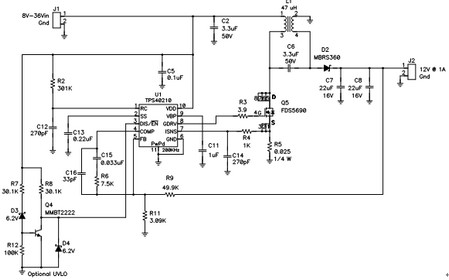 構(gòu)建起如圖3 所示電路,并對(duì)其進(jìn)行描述。該電路可在汽車市場(chǎng)獲得應(yīng)用。這里,其擁有一個(gè)8V 到36V 的寬范圍輸入,可以為穩(wěn)定12-V 輸出以上或者以下。汽車市場(chǎng)更喜歡使用陶瓷電容器,原因是其寬溫度范圍、長壽命、高紋波電流額定值和高可靠性。結(jié)果,耦合電容器(C6) 便為陶瓷的。這就意味著,相比電解電容器,它擁有較高的AC 電壓,同時(shí)這種電路會(huì)對(duì)低漏電感值更加敏感。