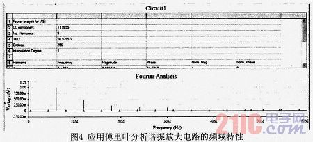 在頻域分析中就是以頻率作為分析的變量,分析信號中不同的頻率分量構成。在頻率分析中,較為重要的概念就是電路的通頻帶與選擇性,作為諧振放大電路一方面要通過所需的頻率成分,因而對其具有通頻帶的要求,另一方面,要抑制不需要的信號的頻率成分,這種通過有效成分抑制無效成分的性質稱為選擇性。但在實際應用中往往要求通頻帶以內傳輸系數盡可能大,通頻帶以外傳輸系數盡可能小,這樣信號失真小,抑制干擾能力強,由此可見通頻帶與選擇性相矛盾,故用矩形系數K0.1說明。理想諧振放大器的頻率特性曲線,其矩形系數K0.1應等于1,實際的諧振放大器的矩形系數總是大于1的。應用軟件的傅里葉分析的頻譜圖如圖4所示。