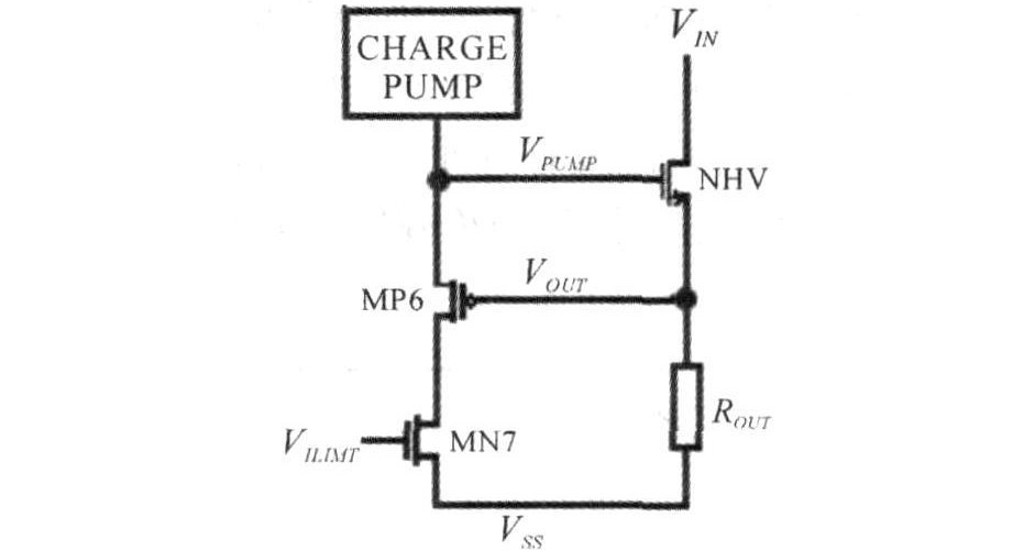 當出現過載和短路故障時,負載電流達到數安培,需要精確的限流電路為功率管和輸入電源提供保護。對于MOS器件,只有工作在飽和區時的電流容易控制。限流就是通過反饋負載電壓,調節電荷泵輸出電壓來實現的。圖4是限流電路的原理圖。