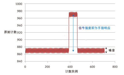 圖5:原始傳感器數(shù)據(jù)由手指響應(yīng)和噪音構(gòu)成。手指響應(yīng),也稱為信號強度,是當(dāng)手指放在傳感器上時通過感應(yīng)系統(tǒng)可以看到的原始計數(shù)的差別