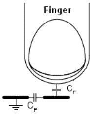 要感應(yīng)到手指的存在,電容式感應(yīng)系統(tǒng)首先要知道沒有手指時的傳感器電容(見圖2a),也稱為寄生電容(Cp)。當(dāng)手指接近或接觸傳感器時(見圖2b),傳感器電容值將會變化,這就產(chǎn)生了和Cp并聯(lián)的另一個電容,稱為手指電容(Cf)。有手指存在時,總傳感器電容(Cx)如方程1所示: