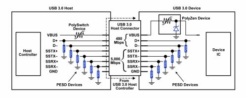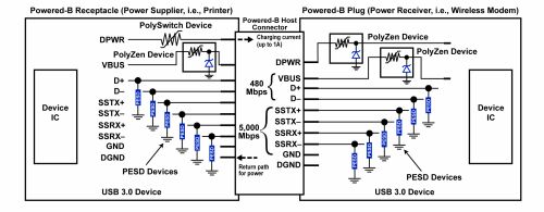 對于USB 3.0設(shè)備,PolyZen器件可安裝在USB輸入端口的VBUS上、Powered-B插頭的DPWR端口、桶形插座電源端口、以及USB集線器的VBUS輸入端。