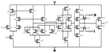 本文所采用的比較器電路如圖5 所示,比較器電路由三級構成,即輸入預放大級、判斷級(或正反饋級)和輸出數字整形緩沖級。預放大級采用有源負載的差分放大器來實現,其放大倍數不用很大,用來進行輸入信號的放大,以提高比較器的敏感度,并把比較器的輸入信號與來自正反饋級的開關噪聲隔離開;判斷級用來將預放大級的信號進一步放大,為比較器的核心部分,電路中通過把m8 與m9 的柵極交叉互連實現正反饋,以具備能夠分辨非常小的信號的能力,并提高此級電路的增益;輸出緩沖級是一個自偏置的差分放大器,它的輸入是一對差分信號,用來把判斷級的輸出信號轉化成邏輯電平(0V 或5V),即輸出高電平VOH=VDD,輸出低電平VOL=GND。