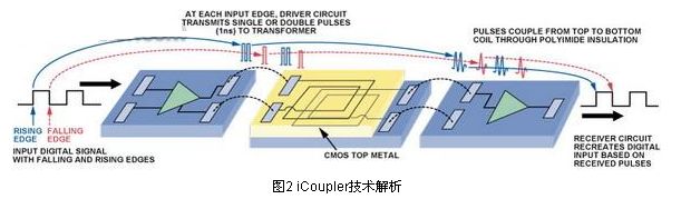 iCoupler技術(圖2)是一種基于變壓器的隔離技術。由于集成了微型變壓器和電子電路,因此它具有光耦合器技術、分立變壓器技術和半導體技術的所有優點,而且還消除了光耦合器和分立變壓器的缺點。光耦合器的缺點在于功耗過高,大的定時誤差,數據速率限制以及對溫度的敏感性。在基于 iCoupler技術的產品中,通過在變壓器線圈之間使用20 µm厚的聚酰亞胺絕緣層,實現了滿足安全機構標準的絕緣。而且,它還能夠實現超過5 kV rms的隔離等級。該技術使用申請專利的刷新電路,在沒有輸入跳變的情況下,通過刷新電路使輸出狀態輸入狀態保持匹配,由此消除了分立變壓器的固有缺陷,可以獲得準確的直流電平。