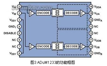 ADI公司的隔離門級驅動器系列產品采用iCoupler技術,其中雙通道 ADuM1233(圖3)提供了輸出通道和輸入通道之間的隔離以及兩個輸出通道之間的隔離,適用于IGBT控制通道的隔離。