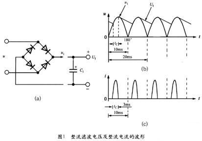 50Hz交流電壓經(jīng)過全波整流后變成脈動直流電壓u1,再通過輸入濾波電容得到直流高壓U1。在理想情況下,整流橋的導(dǎo)通角本應(yīng)為180°(導(dǎo)通范圍是從 0°~180°),但由于濾波電容器C的作用,僅在接近交流峰值電壓處的很短時間內(nèi),才有輸入電流流經(jīng)過整流橋?qū)充電。50Hz交流電的半周期為 10ms,整流橋的導(dǎo)通時間tC≈3ms,其導(dǎo)通角僅為54°(導(dǎo)通范圍是36°~90°)。因此,整流橋?qū)嶋H通過的是窄脈沖電流。橋式整流濾波電路的原 理如圖1(a)所示,整流濾波電壓及整流電流的波形分別如圖l(b)和(c)所示。