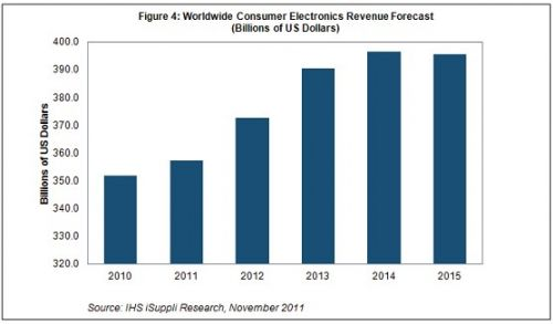 但不都是負(fù)面消息。雖然第二和第三季度的消費(fèi)電子營業(yè)收入低于去年同期水平,但隨著電視與藍(lán)光播放器假日銷售高于2010年水平,上述趨勢(shì)將從第四季度開始逆轉(zhuǎn)。IHS公司認(rèn)為,預(yù)計(jì)2012和2013年增長(zhǎng)率將超過4%,相比于當(dāng)前的低迷狀態(tài),屆時(shí)多數(shù)消費(fèi)電子領(lǐng)域?qū)?huì)恢復(fù)活力。