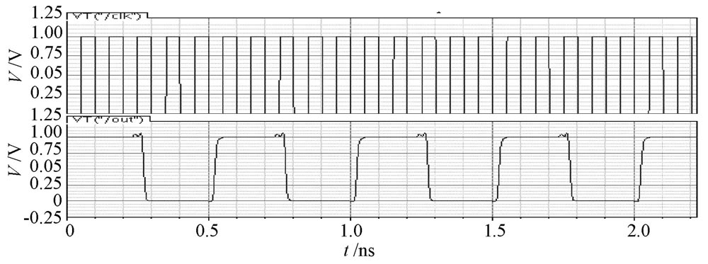 采用Cadence 公司的spect re 仿真器對設(shè)計的分頻器分別仿真, 仿真電源電壓為1 V, 結(jié)果表明: 在典型工藝參數(shù)條件下,基于CML 電路結(jié)構(gòu)的五分頻器最大工作頻率是8 GHz, 最小工作頻率是1 kHz, 當(dāng)工作在8 GHz 時, 功耗為1. 7 mW, 輸出信號占空比為49. 76% ; 基于T SPC 電路結(jié)構(gòu)的五分頻器最大工作頻率是10 GHz, 最小工作頻率是10 MHz, 當(dāng)工作在10 GH z時, 功耗采用10 ns 內(nèi)的平均功耗, 功耗為0. 2 mW, 輸出信號占空比為49. 92%.由于是單端輸入輸出, 基于T SPC 電路結(jié)構(gòu)的分頻器抗噪聲能力較弱。最高工作頻率下的仿真結(jié)果如圖4, 圖5 所示。