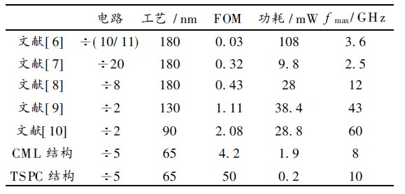 式中: fmax 是分頻器的最高工作頻率; P 是分頻器在最高工作頻率下的功耗, 表2 為本文設(shè)計的分頻器和其他文獻(xiàn)中介紹的分頻器作對比,所有的分頻器均采用CMOS工藝, 對比表明本文設(shè)計的5 分頻器性能較優(yōu),在65 nm 工藝下具有明顯的功耗低優(yōu)勢, 尤其是采用TSPC 電路結(jié)構(gòu)的分頻器, 功耗極低。