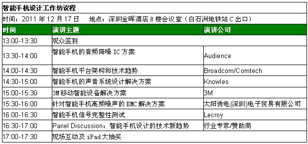 HTC、SAMSUNG、LG、SHARP、AT&T、SK Telecom、PANTECH、DoCoMo 等手機設計領軍廠商在智能市場領域的競爭非常激烈,他們都用到哪些技術?由我愛方案網(www.52solution.com)、電子元件技術網(m.sg1668.com)和China Outlook Consulting主辦的首屆智能手機設計工作坊(Smart Phone Design Workshop)將于2011年12月17日下午在深圳金暉酒店8樓會議室隆重召開!為您Hold 住 2012 智能趨勢,給力手機開發設計!