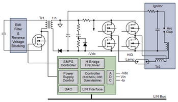 安森美半導(dǎo)體的全功能高強(qiáng)度放電(HID)(或氙燈)專用集成電路有助于改善前燈系統(tǒng)的性能。相對(duì)于傳統(tǒng)的鹵素?zé)?,HID改善了顯色性,降低了功耗,使用壽命更長(zhǎng),光輸出更高。為了支持其先進(jìn)的功能,需要高效率的HID大燈鎮(zhèn)流器和復(fù)雜的控制電路。安森美半導(dǎo)體的HID燈控制系統(tǒng)是采用8位微控制器或?qū)S脿顟B(tài)機(jī)的混合模擬/數(shù)字解決方案,它集成了DC-DC控制器,具備全面的診斷功能(過(guò)壓、欠壓、溫度傳感器、續(xù)航時(shí)間計(jì)數(shù)器)、各種通信接口(LIN、SPI),支持35 W(D1/D2/D3/D4)和25 W(D5)燈。圖3為該專用集成電路的框圖。
