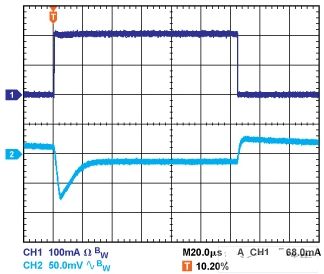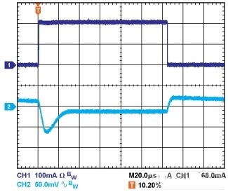 輸出電容還會影響調節(jié)器對負載電流變化的響應??刂骗h(huán)路的大信號帶寬有限,因此輸出電容必須提供快速瞬變所需的大多數負載電流。當負載電流以500 mA/ μs的速率從1 mA變?yōu)?00 mA時,1 μF電容無法提供足夠的電流,因而產生大約80 mV的負載瞬態(tài),如圖1所示。當電容增加到10 μF時,負載瞬態(tài)會降至約70 mV,如圖2所示。當輸出電容再次增加并達到20 μF時,調節(jié)器控制環(huán)路可進行跟蹤,主動降低負載瞬態(tài),如圖3所示。這些示例都采用線性調節(jié)器ADP151,其輸入和輸出電壓分別為5 V和3.3 V。