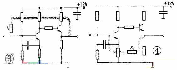 如圖3所示放大電路,由于反饋導(dǎo)線越過放大器基極電阻。可能產(chǎn)生寄生耦合,影響電路工作。圖4所示電路的布設(shè)將反饋元件置于中間,輸出導(dǎo)線遠(yuǎn)離前級(jí)元件,避免干擾。