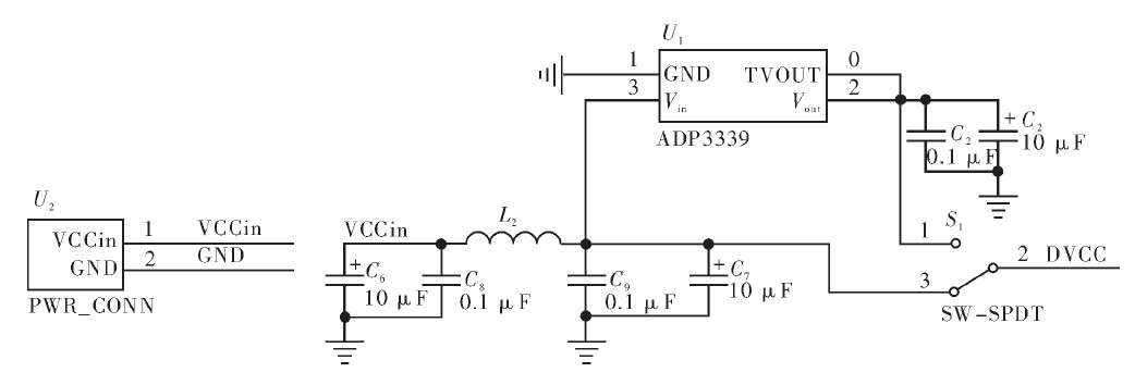 傳感器節(jié)點體積微小,通常攜帶能量有限的電池。能量供應(yīng)模塊在無線傳感器節(jié)點中至關(guān)重要,為傳感器節(jié)點各部分提供能量。需要長時間數(shù)據(jù)采集的傳感器有的需要太陽能等方式來維持節(jié)點的正常運轉(zhuǎn)。節(jié)點的各部分也需要精心設(shè)計。節(jié)點微處理器的工作電壓為1.8~3.6 V,無線射頻芯片工作電壓為2.1~3.6 V,Flash供電電壓為2.7~3.6 V,USB轉(zhuǎn)換芯片由USB供電。因此電源可以選用3 V紐扣電池供電,有效減少了節(jié)點的大小。另外USB也可以作為供電源,同時作為編程電源,電源單元如圖2所示。LC濾波單元對交流電具有較好的濾波效果,同時又不會降低直流輸出電壓。低壓差的穩(wěn)壓器ADP3339保證了電源較好的穩(wěn)壓性。