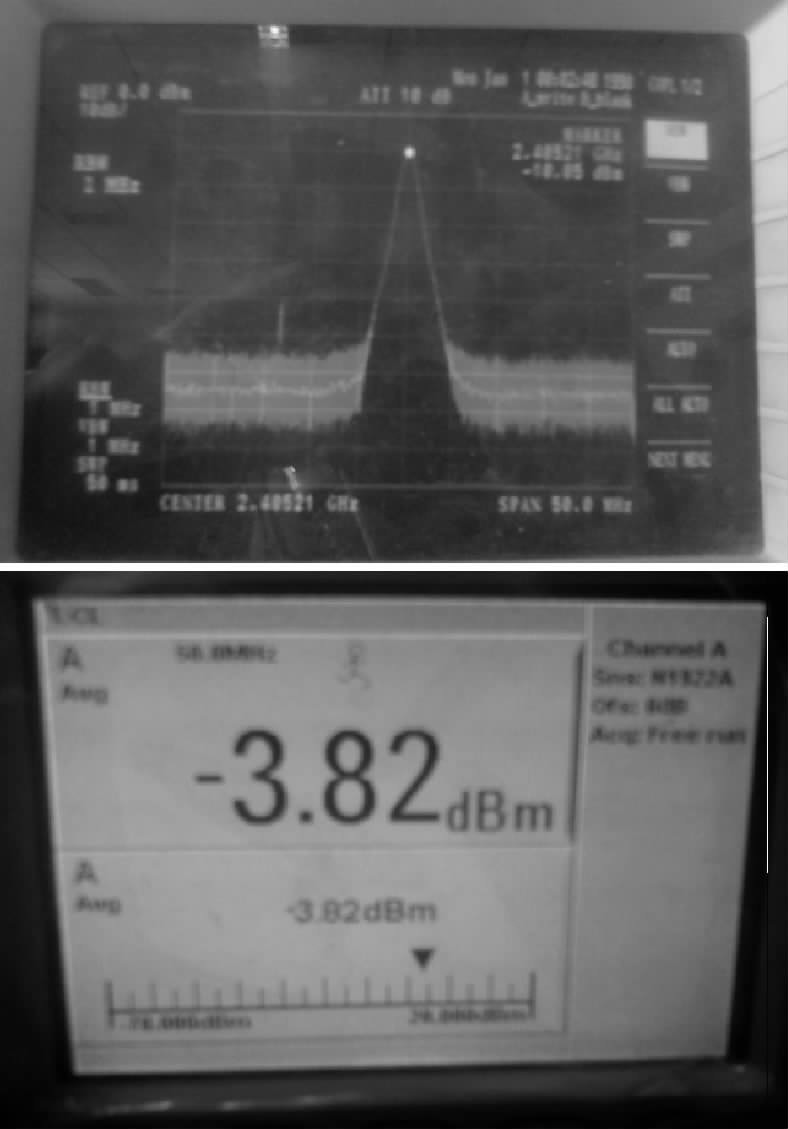 為對設(shè)計的節(jié)點功能進行驗證,首先使用IAR集成開發(fā)環(huán)境編寫CC2420的測試程序,通過JTAG將程序燒入Flash,經(jīng)過檢測,射頻部分較好地滿足了預(yù)期。芯片工作頻帶范圍為2.4~2.48 GHz,發(fā)射功率為0 dBm.經(jīng)過頻譜儀和頻率計驗證設(shè)計符合要求,驗證結(jié)果如圖9所示。